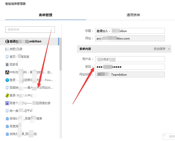 3、然后在弹出的“表单管理”中找到需要保存密码的网站或平台,在右侧的“表单内容”中填入用户名和密码,然后点击“保存”按钮即可。