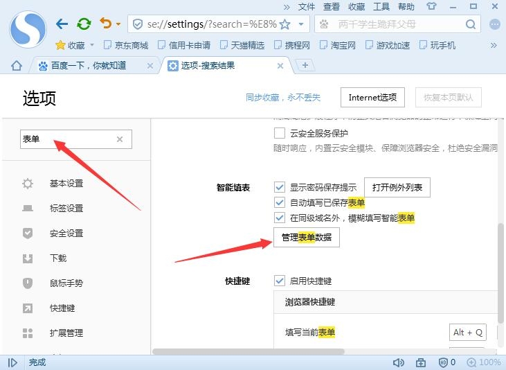 2、在弹出的“选项”页面中,左边的输入框中输入“表单”二字,在右边会出现所有含有表单二字的功能选项,然后找到智能填表,其中的“管理表单数据”按钮点击一下。