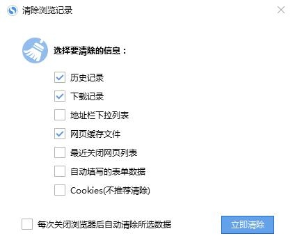 2、弹出来“清除浏览记录”窗口,用户需要选择要清除的信息,在需要清除的选项前面小方格里打勾,选择完毕后点击“立即清除”按钮。等待一会就清除完毕了。