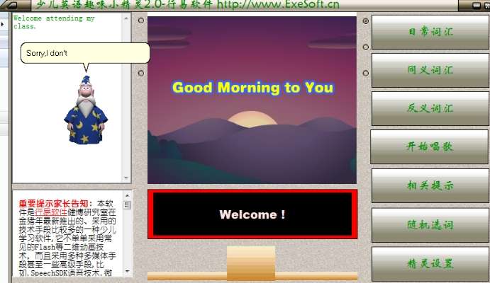5、每个小精灵加入对话、听力、跟读等方式,并紧密结合著名少儿学习教材和小学初中的课堂教材的同步内容。