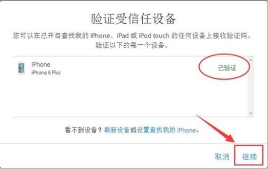 第一步,点击【开始使用】之后,系统会提示需要你用您常用的一台设备验证它的提示信息,点击【继续】;