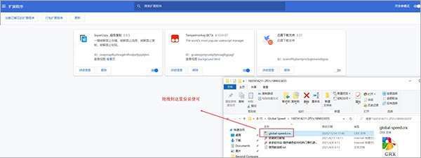 3、在扩展程序中,开启开发者模式,并将在本站下载的global-speed.crx插件直接拖拽到空白界面进行安装