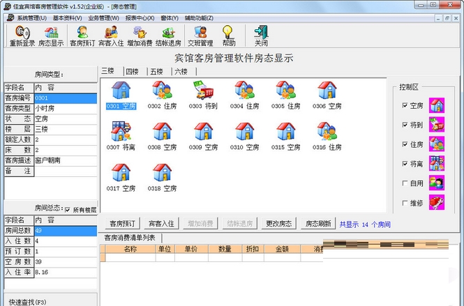 ●“房态显示”登记宾馆客房当前状态和客户入住情况,及时掌握宾馆客房占用情况,方便及时准确的安排客房客房预订。