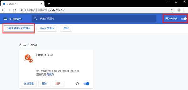 2、进入到扩展程序页面,打开开发者模式,加载已解压的扩展程序,选择解压后的文件夹,安装成功后可以看到postman。