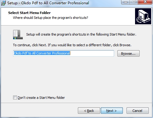 5、对开始菜单文件夹选择,默认文件夹“Okdo Pdf to All Converter Professional”,点击Next;
