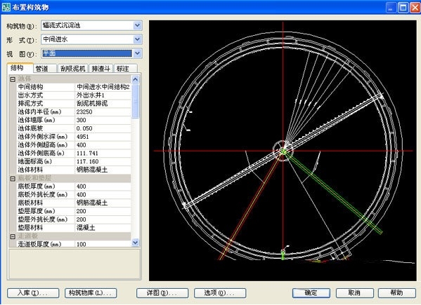 自动绘制配水井、幅流沉淀池、污泥浓缩池平面图、剖面图和详图。