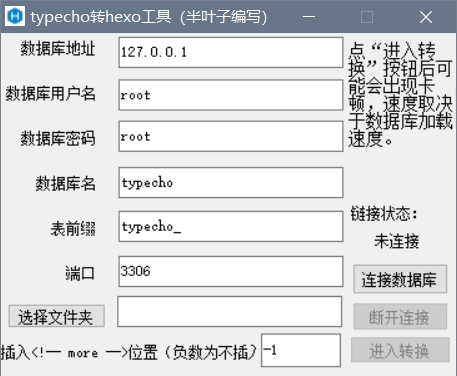 1.首先先填好数据库的“数据库地址”(地址要带http(s)、/等)、“数据库用户名”、“数据库密码”、“数据库名”、“表前缀”、“端口”,以及“选好文件夹”(文章和评论导出保存的地方)
