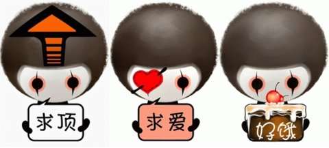 一个圆头闪电脸的小男孩儿,坐地上手里拿着带字的牌,表情有:欣赏,早安,被虐,心碎,追求,妖孽,求顶,求爱,好饿,晚安,受伤,悲剧等等。