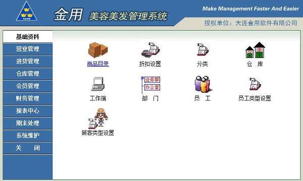 金用美容美发软件最新版是一款美容美发门店经营管理软件。金用美容美发软件最新版包含了商品目录、折扣设置、部门管理、员工管理、顾客类型设置、前台查看、收银查询、进货管理、仓库管理、会员管理、财务管理以及报表中心等主要功能。金用美容美发软件可以随时备份系统中的数据。