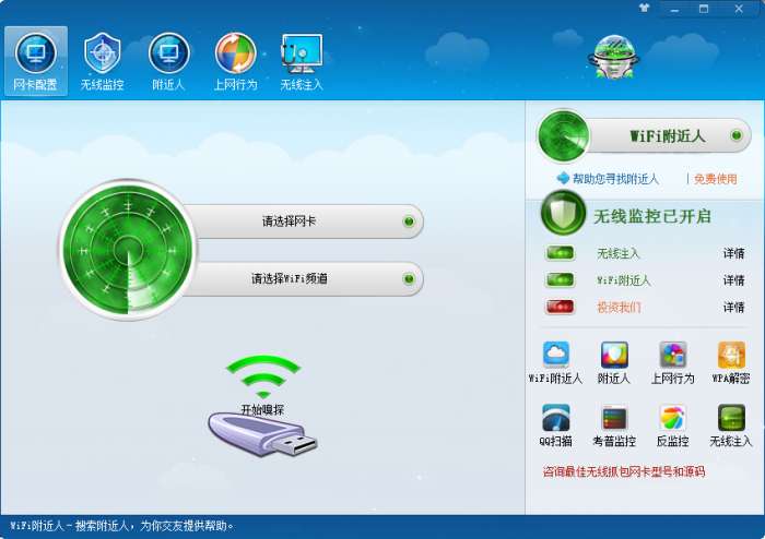 考普wifi附近人官方版是一款实用的WiFi工具。考普wifi附近人最新版主要用于解决企业对自己无线路由器的上网管控和安全问题。考普wifi附近人官方版还有社交软件聊天内容、加密邮件内容、上网行为和无线注入四大核心功能,支持Windows 7、8的系统,先安装驱动程序,注意区分32和64位系统。