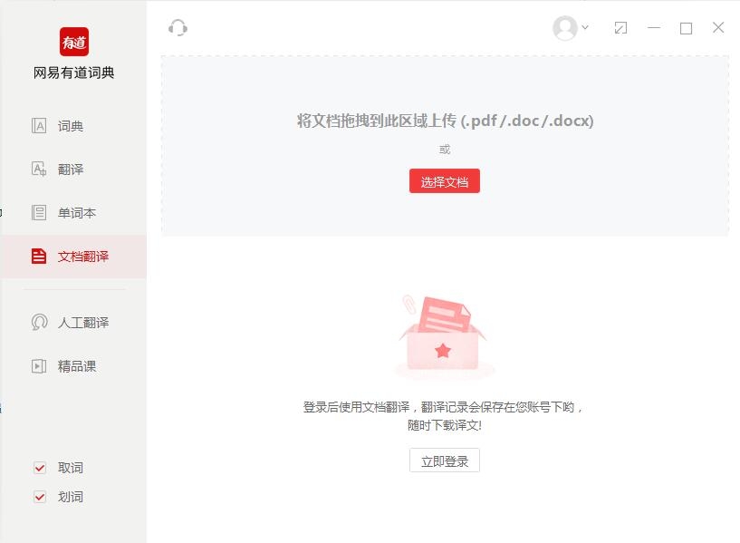 5、我们更可以“文档翻译”,点击左侧的“文档翻译”,将文档拖拽到上方区域上传或者点击“选择文档”按钮,注意上传格式(.pdf/.doc/.docx)。