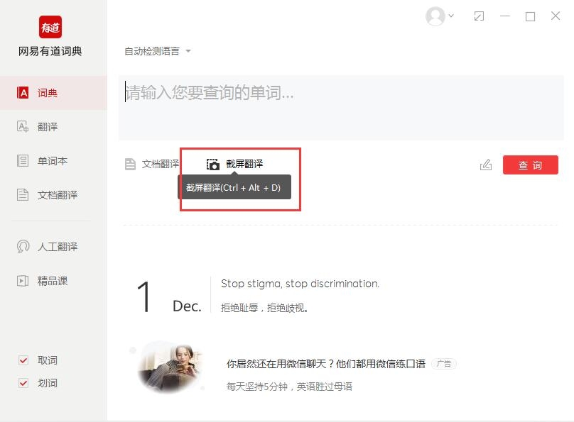 1、打开有道词典的主界面,点击左侧“词典”,然后点击如下图中所示的“截屏翻译”按钮(或者用快捷键Ctrl+Alt+D),然后就可以截图翻译了。