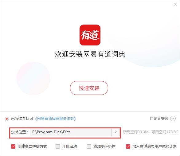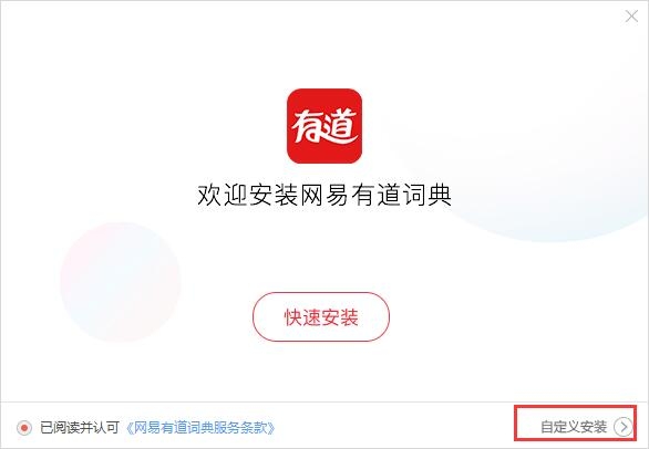 2、双击打开“YoudaoDictSetup.exe”文件,看到安装界面,用户可以点击“快速安装”选择系统默认的安装地址进行安装,也可以点击“自定义安装”自主选择安装路径,这里小编推荐自定义安装。