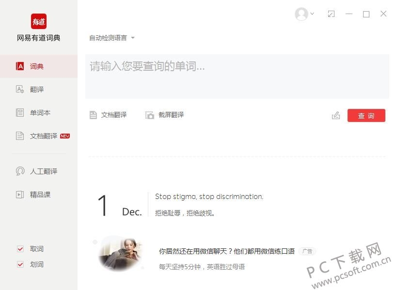 1、首先从PC下载网下载了有道词典并安装完毕之后,打开软件出现主界面,左侧栏目出现“词典”“翻译”“单词本”“文档翻译”等选项。