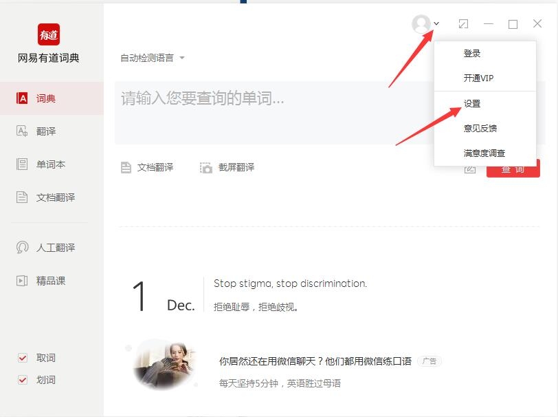 1、打开有道词典的主界面,在上方一个小人头的图标的旁边有个“∨”图标点击它,在出现的下拉中点击“设置”选项。