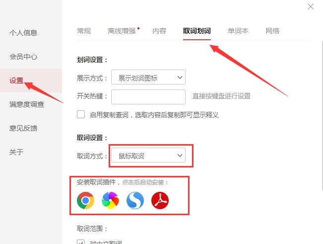 2、在弹出的设置框中,先点击上方的“取词划词”,然后在下方出现的取词方式改外“鼠标取词”,最后再安装取词插件,您使用什么浏览器就点击那个浏览器的图标,然后会自动安装。