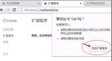 4、拖拽进来后谷歌浏览器会弹出提示框,提示你是否要添加“IE Tab”,我们点击下方的添加扩展程序就可以添加进来了。