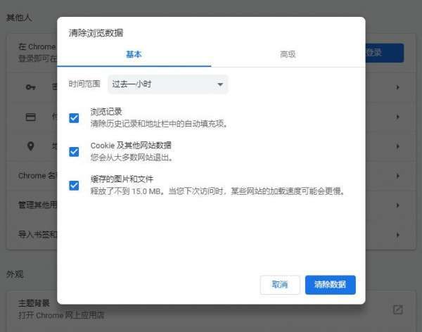 2、点击之后,“清除浏览数据”的对话框将会弹出。有基本和高级两个选项栏,基本选项中可清除浏览记录、缓存、cookie等基础数据,选择高级选项可清除更多缓存数据。