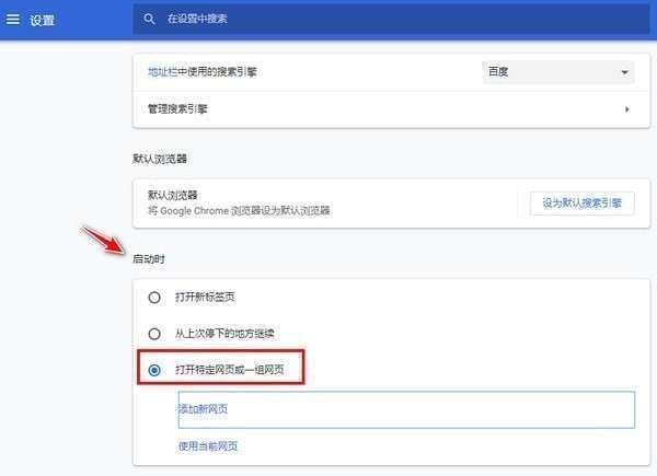 4、接下来我们还要设置在启动时打开主页,设置选项中下滑找到“启动时”选项,然后选择“打开特定网页或一组网页”,然后输入想要设置的主页就可以设置成功了。