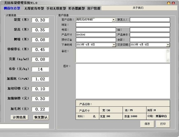 1、我公司为专门从事无纺布环保袋的厂家,在长期的计算价格中,感觉非常麻烦,有时间还会出错,所以我们开发了这一套软件,针对各种款式的手提袋,直接输入然后点击就可以计算出其价格,并能管理客户资料和打印生产单。是中小型无纺布袋厂的管理系统,为我们更好的管理业务提供强大的帮助。