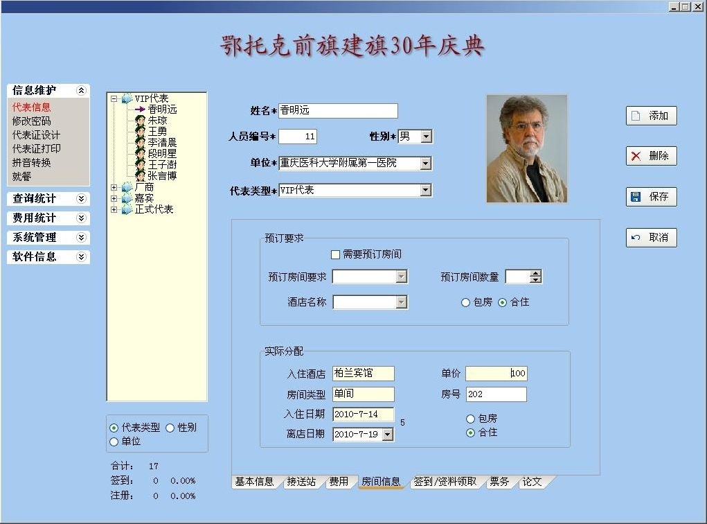 2、提供代表基本信息(含照片,可从摄像头捕捉)、住宿信息、费用信息、资料领取(出席活动)信息、接送站信息、票务信息、就餐信息、乘车信息等录入、查询统计功能并导出excel功能;