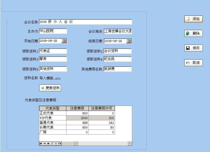 4、会务管理:维护会务的具体信息。领取资料1-5可以自选定义资料名称,为空则在[代表信息]页面不显示该项。其他费用类同。从0.6版本开始取消了多个会议选择,请将数据库重新拷贝后在原会议基础上直接修改。