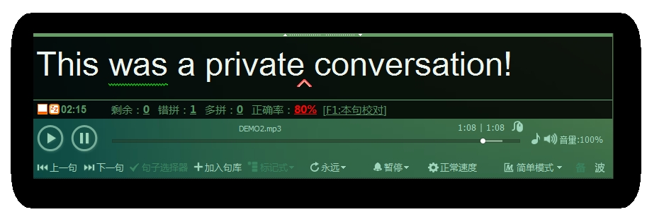 3、“单句听写”和“自由听写”可以没有参照文本,但如果需要校对,就必须有“校对文本”。