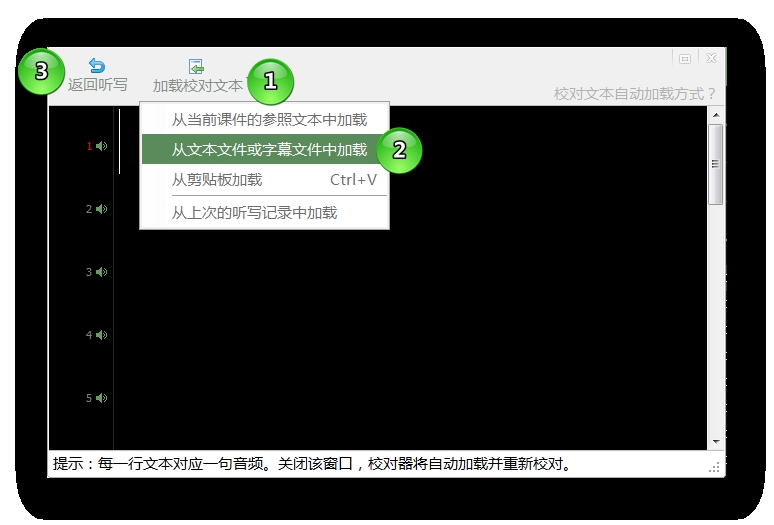 4、 单句听写和自由听写时,如果缺少“校对文本”,软件会提示您“加载校对文本”: