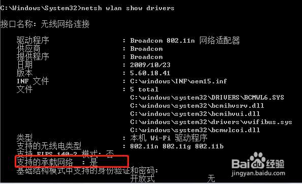 7、用cmd命令检查,电脑是否支持承载网络,出现的是,就可以共享WiFi了。