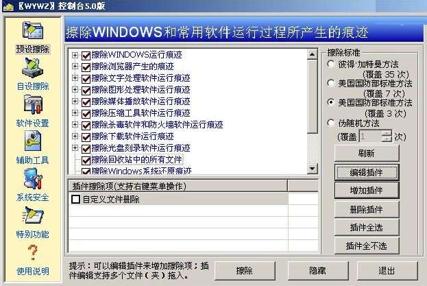 wywz是一个保护你的计算机隐私的小型绿色软件,如果你不注册为开机自动启动以及右键关联则为绿色软件,所有配置都记录在配置文件中,可以方便的在移动磁盘中保存使用。wywz能够全面、快速、自动地擦除windows中常用软件使用痕迹以及你自己定义的擦除,并且经过她“擦除”的数据是无法恢复的。
