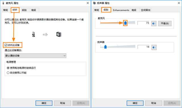 3)弹出 [麦克风属性] 窗口,在 “侦听” 菜单中取消选中 “侦听此设备” 选项,并在 “级别” 菜单中麦克风音量设置为70%〜90%左右。如图