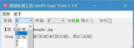 在下拉选项中设置“原调”与“转调”。设置好后,此时还不能导出转调后的结果 ,需要对原简谱进行识别。