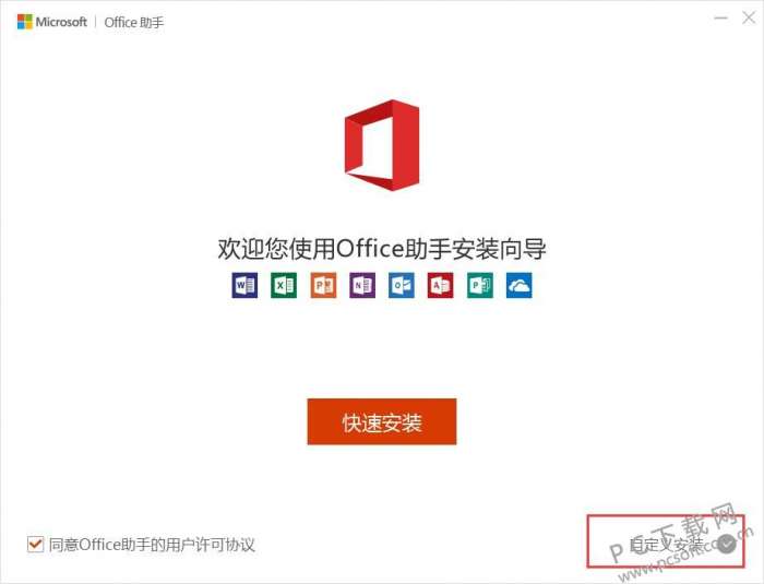 2、双击打开下载的exe文件,进入office2010安装界面,用户可以点击“快速安装”按钮选择默认地址进行安装,也可以点击“自定义安装”自由选择地址进行安装,这里建议选择自定义安装。
