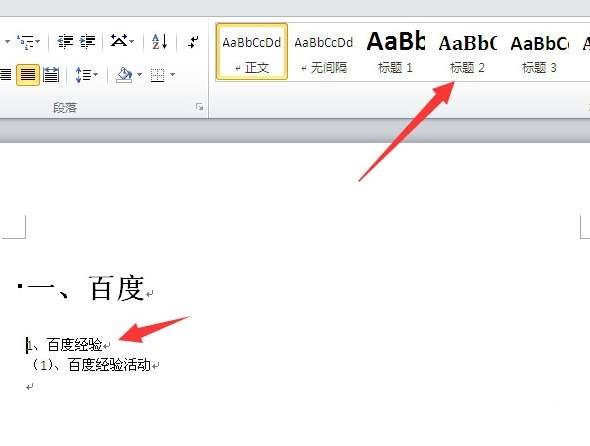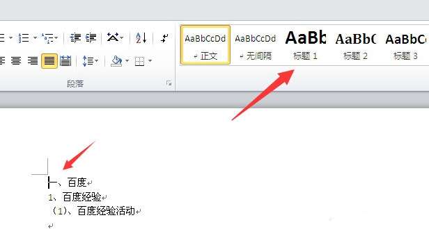 1、在Word 2010中,将输入符放到一级标题前,然后点击【开始】菜单中的【标题一】。