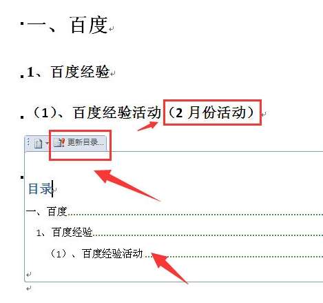 5、如果word文档内容页中标题有更新的话,自动生成的目录不会自动更新,需要点击生成目录上面的【更新目录】设置。