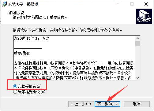 3、仔细阅读许可协议,选择“我接受协议”,点击“下一步”