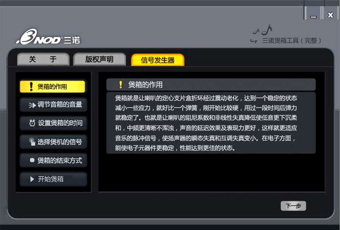 3、设置煲箱的时间,这里每个时间段都以指数形设定,也就是最开始信号强度为-6ab,运行一段时间自动转为-3db,再转为0db,以此让音箱逐步适应,在这里用户可设置的时间为1小时、3小时和9小时,完成设置点击下一步