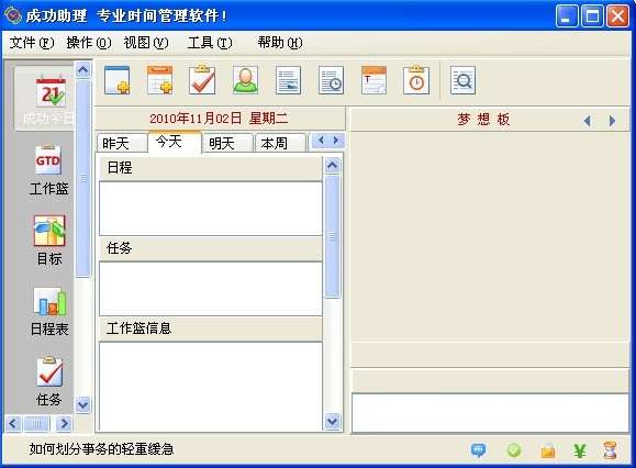 成功助理官方版是一款用于帮助用户惊醒时间管理的软件。成功助理最新版据高效时间管理原则设计的日程、任务功能,助您快速成为高效能人士。成功助理官方版借鉴《攻心为上》麦凯66条而设计的人脉薄,助您稳步打造黄金人脉资源;博客式、多媒体日记资料功能,易用便捷,声色并貌,记录您多彩人生。