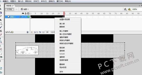 7、选中第35帧,然后把汽车拖动到车道的左侧。