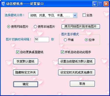 2、你也可以选择“使用本地图片”,然后你可以自行到网上下载各种精美壁纸图片,按照动态壁纸秀软件生成好的“pictures”文件夹下的各种图片类别,放置你所自行下载好的图片,之后你需要点“设置窗口”中下方的“确定”按钮,保存你所作的更改,动态壁纸秀软件就可以自动帮你定时切换背景图片了。