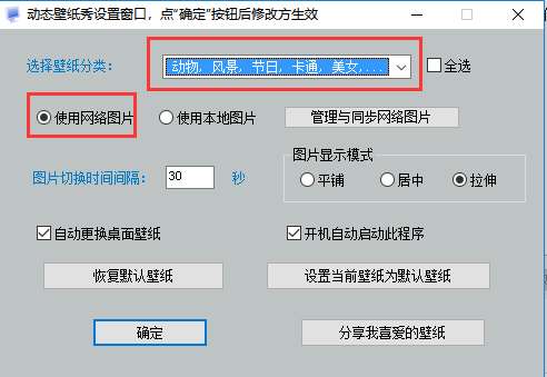 1、从本站下载好压缩包后,双击压缩包中的“setup_dynamicwp.exe”,在弹出的“设置窗口”中,选择壁纸分类,目前包括“动物, 风景, 节日, 卡通, 美女, 汽车, 帅哥, 宝宝, 游戏, 其它,清凉美女,海底世界”十二大类,默认是选中“使用网络图片”,动态壁纸秀软件会自动帮你从网上下载你选定类型的图片。