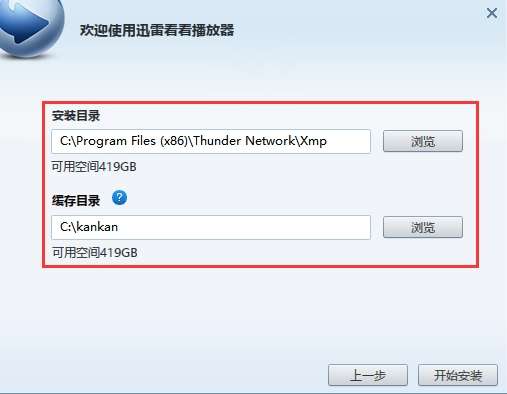 2、迅雷看看播放器选择一个合适的安装位置:默认是安装在C盘目录下的,可点击浏览选择其它非系统的安装目录,建议用户安装在D盘中,接着设置一下缓存目录再点击开始安装即可。