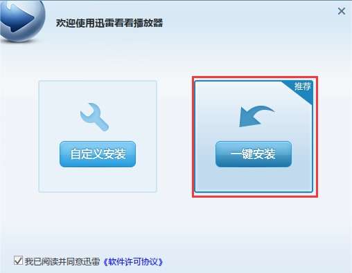 1、双击打开下载的迅雷看看,双击程序文件。之后就会打开如下图的安装界面,在这里有两种安装方式供大家选择【自定义安装】:勾选软件许可协议,点击自定义安装继续。