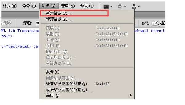 2、新建HTML之后,我们找到菜单里“站点”一栏,点击之后,下拉菜单出现“新建站点”和“管理站点”,如下图所示: