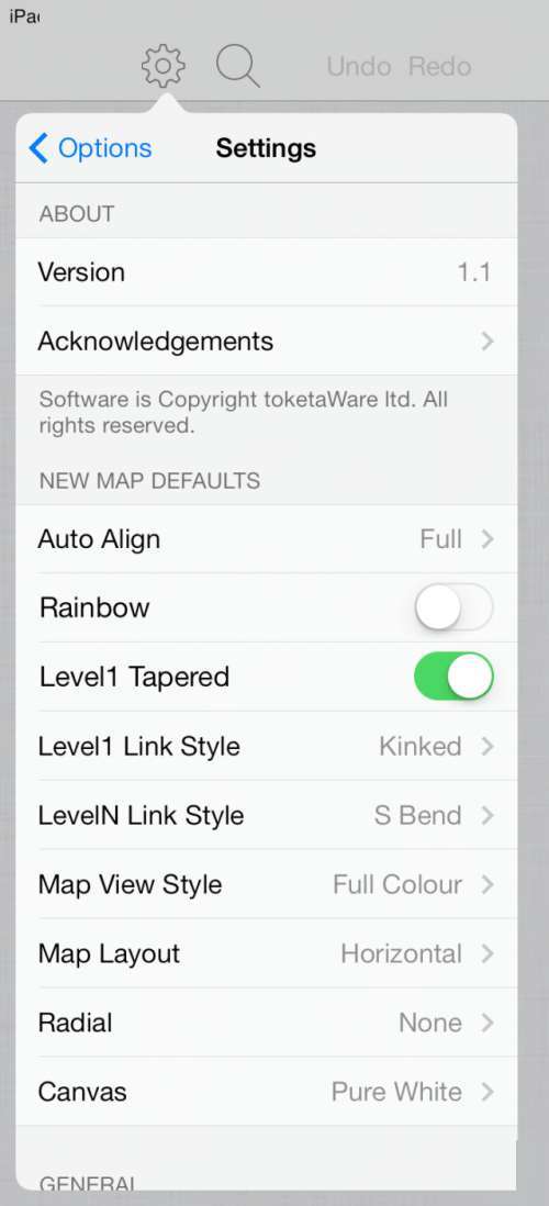 齿轮按钮用来给导图进行模板设置,从层级风格到自己粗细均能设置。吐槽一句,没有原生中文支持对很多用户来说是个障碍。