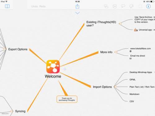 新版 iThoughts 的图标进一步向 Apple 原生风格靠拢,毫无违和感。首次打开,会展现一张名为「Welcome」的导图,既是一张完美的模版,也在字里行间展现了全部功能。工具栏只有简洁的一列,寥寥几个按键就能完成百分之 80% 的操作,易于上手。