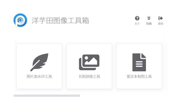 洋芋田图像工具箱最新版是一款十分优秀的图片处理软件,洋芋田图像工具箱最新版界面简洁,功能出众,支持对图片水印的添加和消除,支持将多张图片拼合为一张长图,不仅如此,洋芋田图像工具箱官方版还可以进行图片裁剪,非常适合从事相关职业的人员使用。