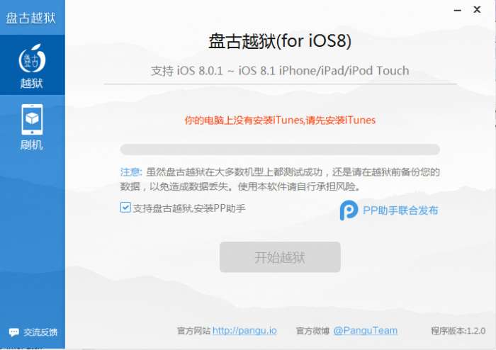 盘古越狱(ios8.0-8.1.x),支持iPhone 4、iPad Air、iPad mini、iPod touch 5及更新设备,集成刷功能,可一键刷机。