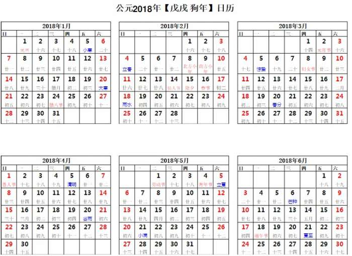 公元2018年,公历平年,共365天,53周。农历戊戌年(狗年),无闰月,共354天。