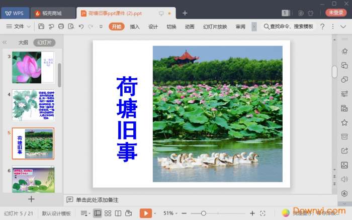 荷塘旧事ppt课件为你在学习中了解作者写这篇回忆散文的内容,通过作者笔下的随想来了解作者写作时的心情已经对陈年往事的怀念。课件也是比较生动的展现了荷花的内容。欢迎来体验!